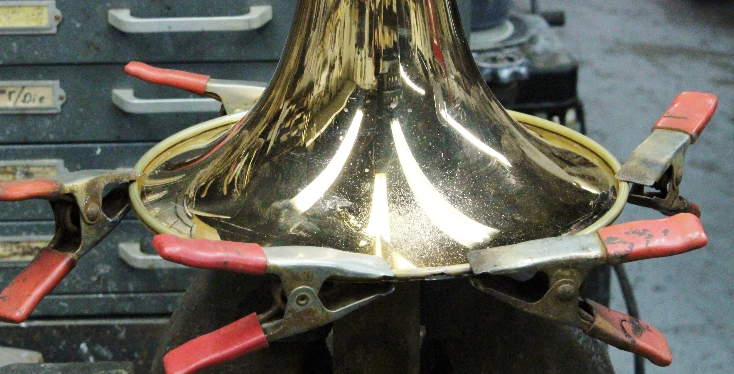I occasionally get inquiries for information on replacing bell rims for a variety of reasons. Fabrice Wambergue of Atelier W, outside of Paris, wanted to know my technique both for repairing instruments with broken and ragged rims as well as reducing rim size for aesthetic purposes. He was considering modifying a Besson cornet into a pocket version, like I did for Nick DeCarlis. I did my best to describe the process to him, but I had never taken photos to use as a visual aid. Now that I've finally remembered to take the time to record images, it is time to present this here.