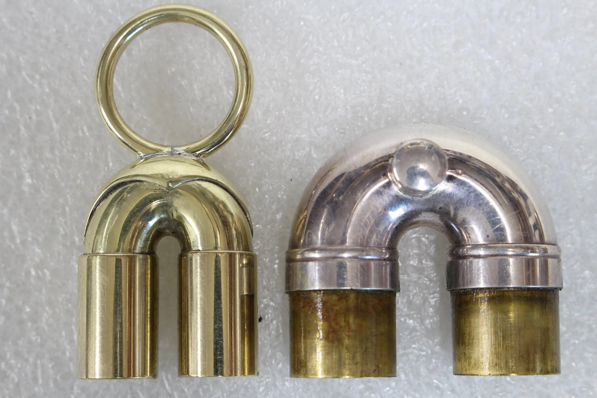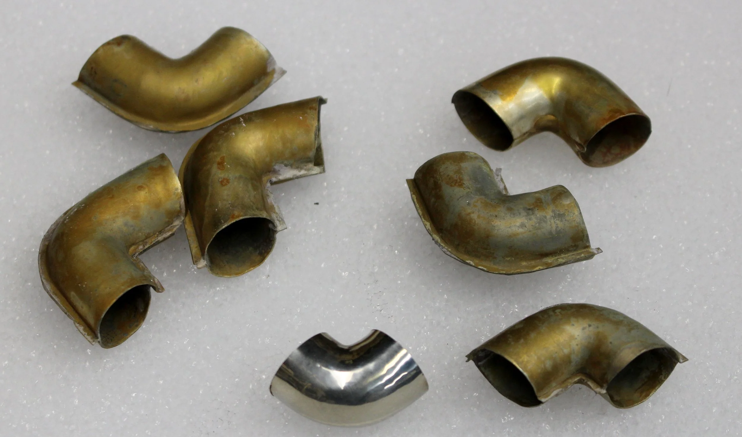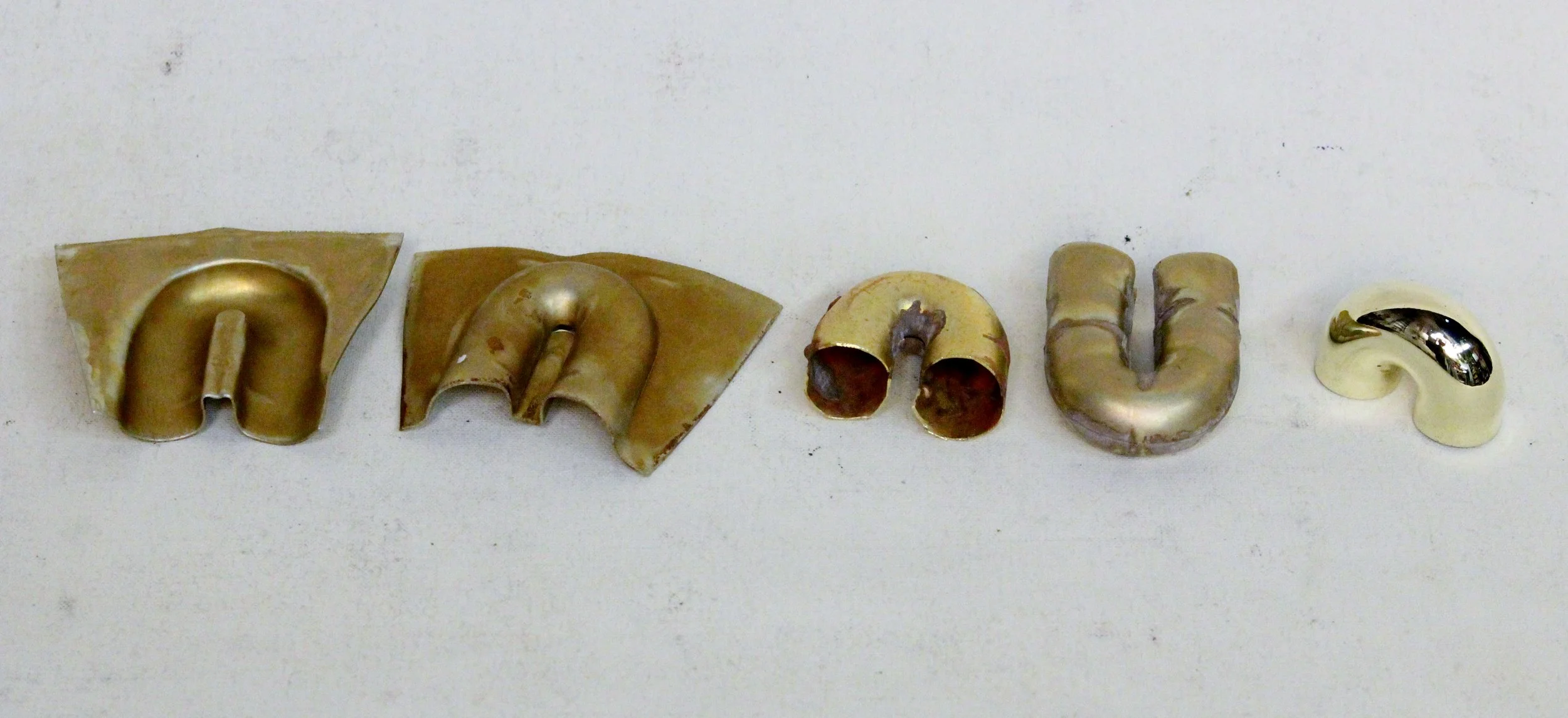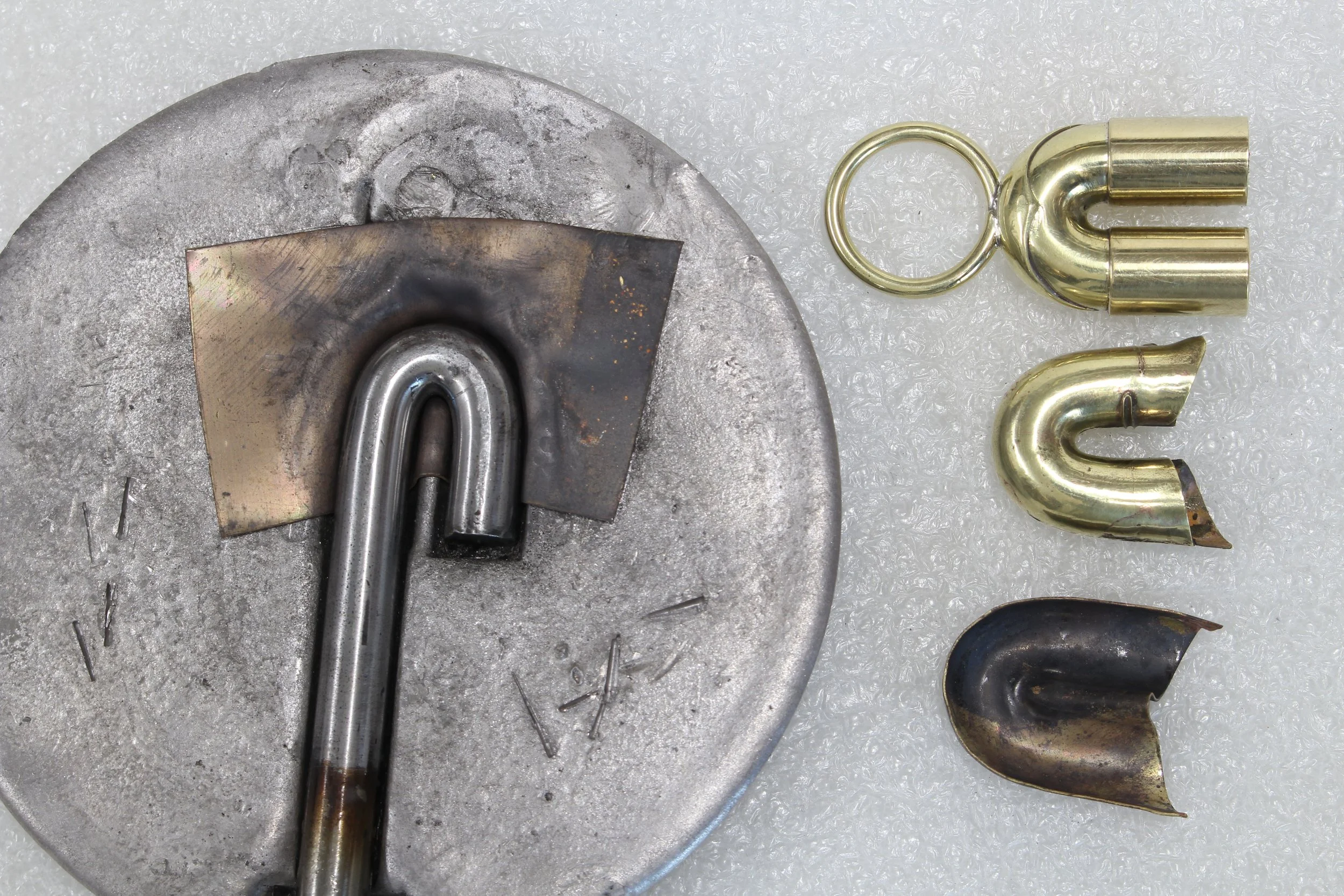 The crooks in the Graves cornet are such a tight curve that the outside radii were stretching too thin and most of them were tearing open as seen in the one in the first photo. Nickel silver tears more easily than brass and this was happening even when annealing in between using successively larger balls. I realized that I would need to make these crooks in two pieces as in the originals. The second photo shows the stages in making these.