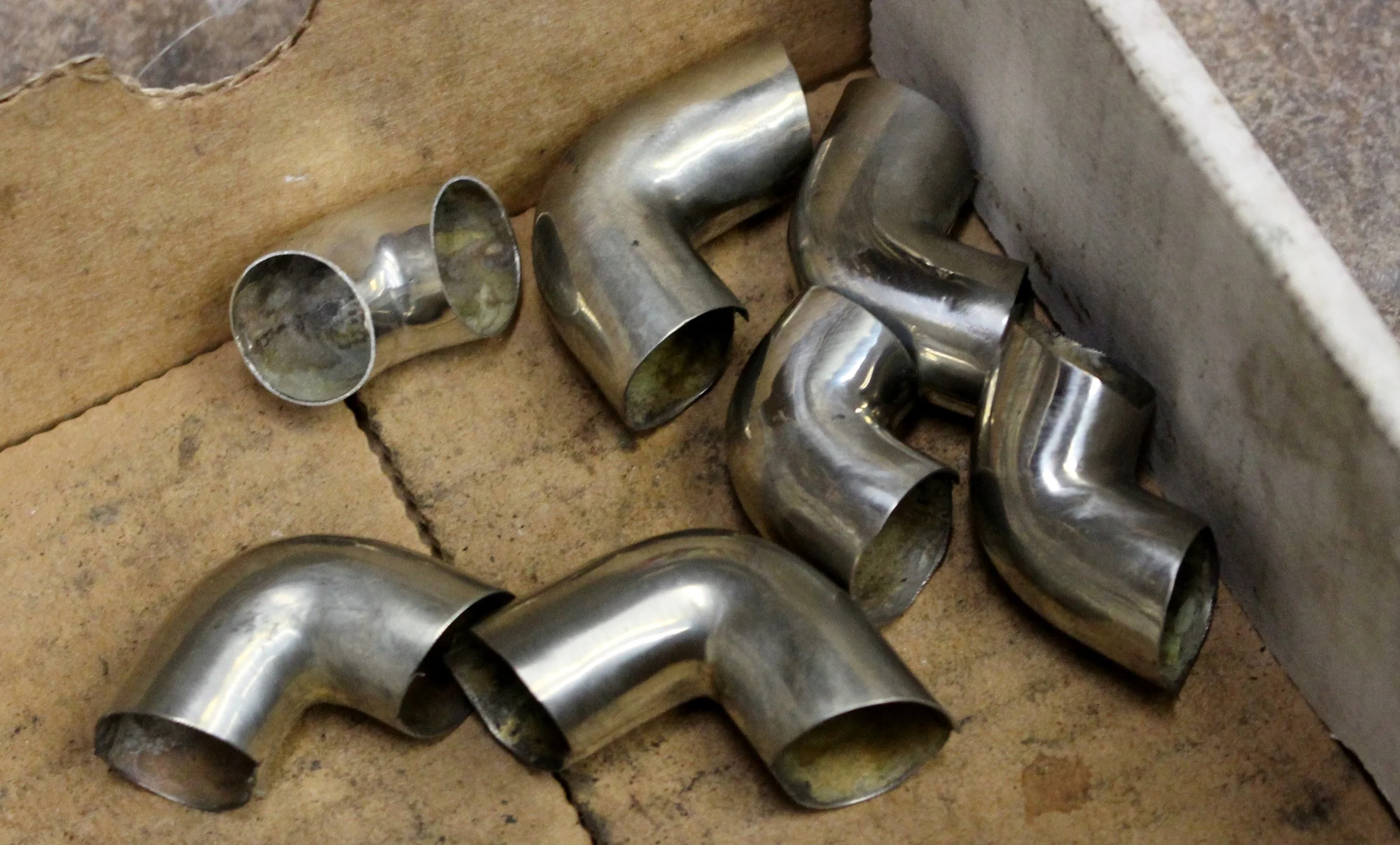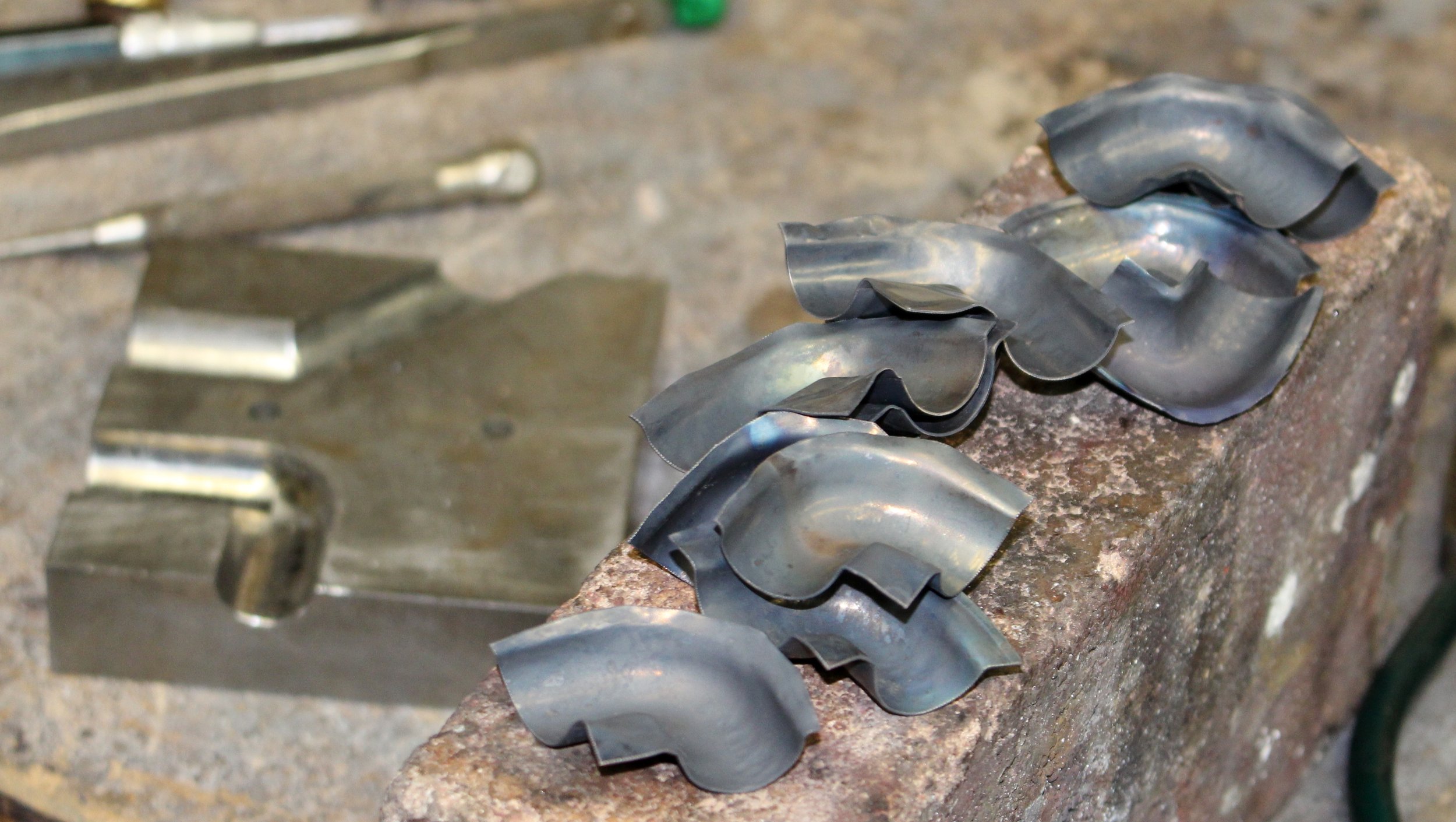 Stamping the two halves also required several steps, annealing in between. The metal would tear if forced to the final shape in one stamping. I bent a steel bar, slightly smaller diameter than the finished bore, to the same curve. This is used to stamp the sheet into one half of the steel die.