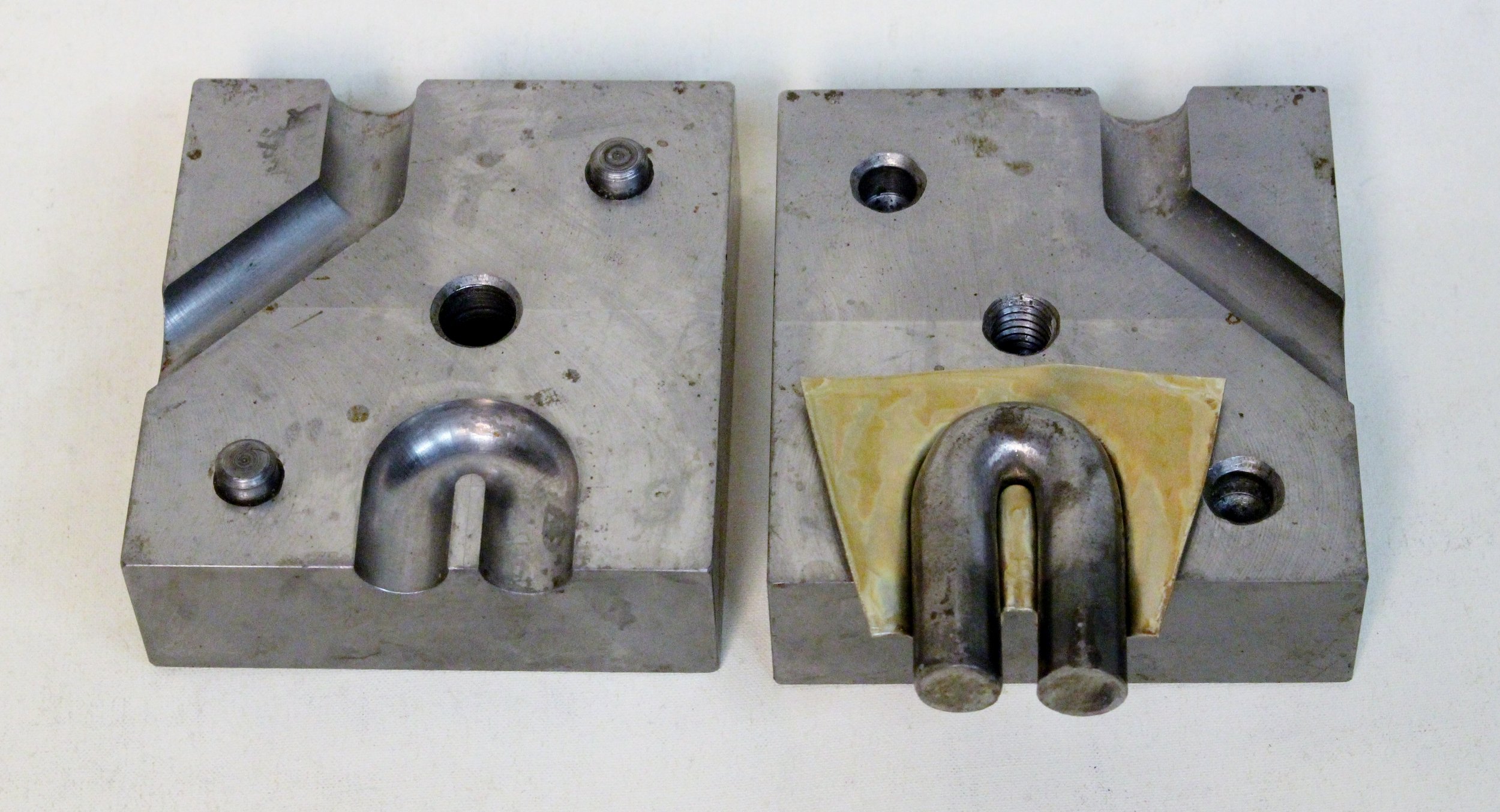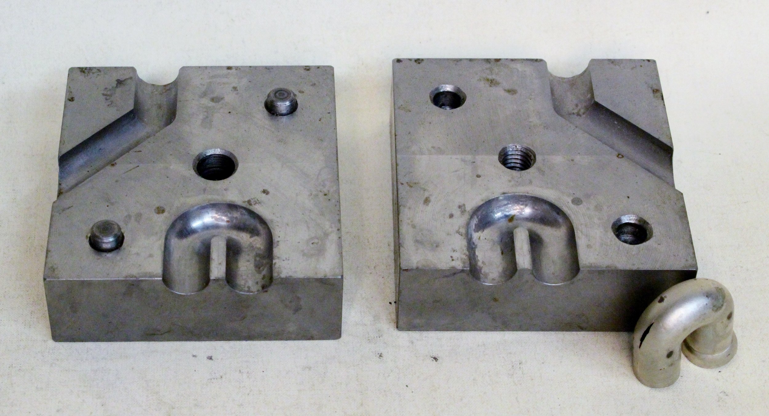 This set was made to reproduce the very tight crooks and 45 degree tubes to make new valves, needed for the restoration of a Graves cornet. An annealed (softened by heating) tube that is smaller diameter and thicker wall than the finished size is forced into the closed die, usually while filled with pitch. Alternatively, the pitch filled tube is bent in a jig to a shape that will fit in the die. After emptying the pitch and annealing the tube again, it is placed in the die and balls are forced through it to form the finished crook.